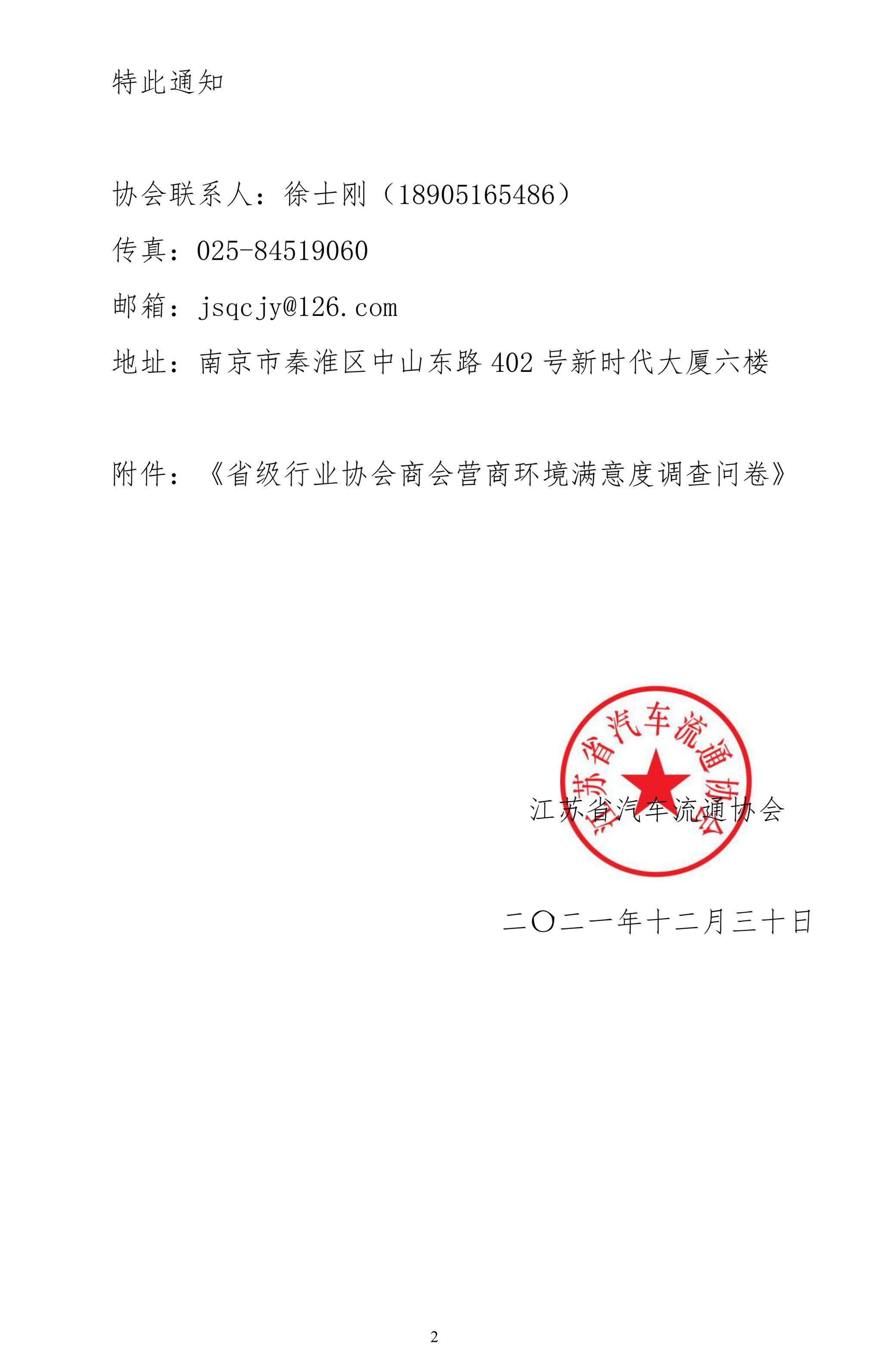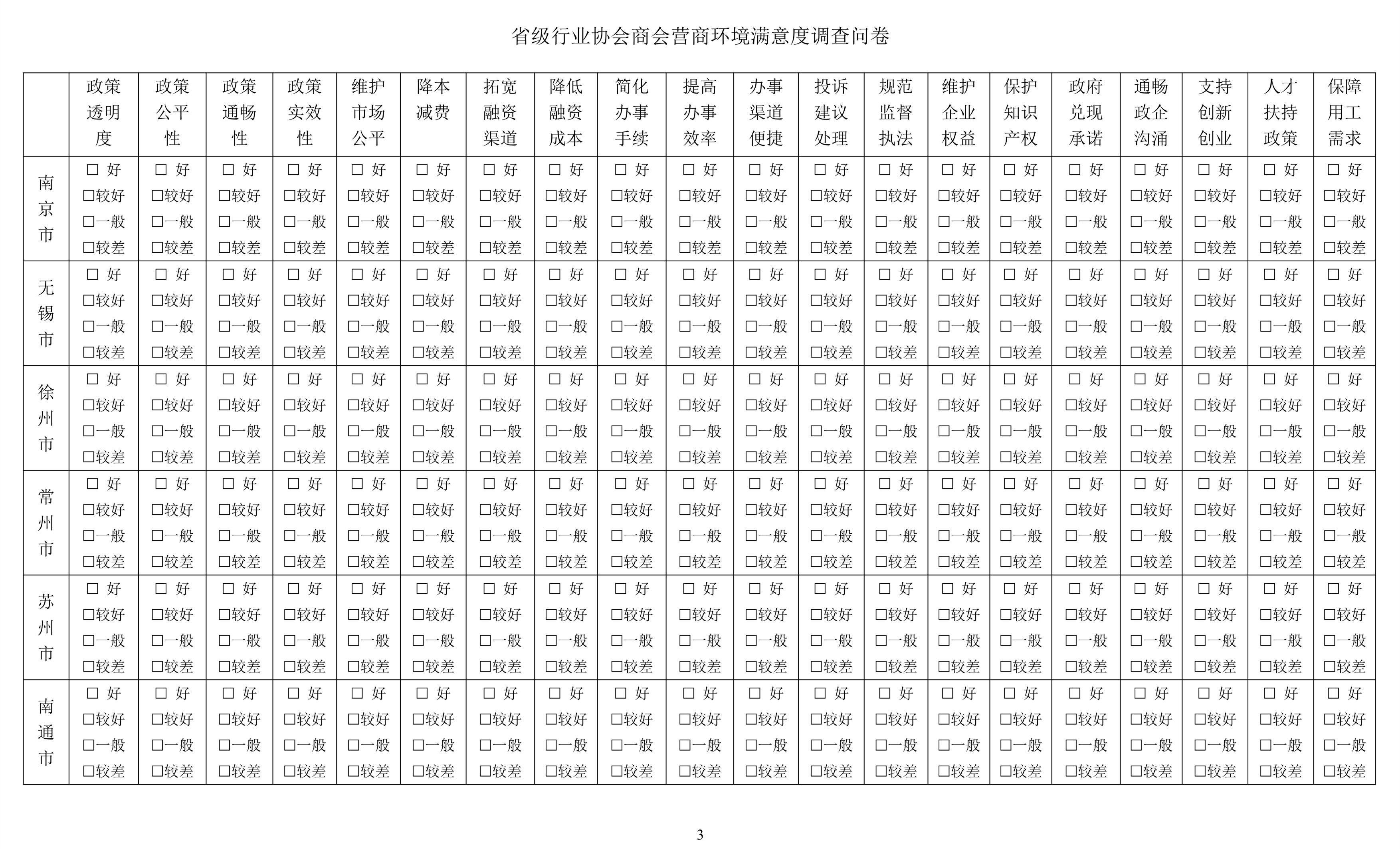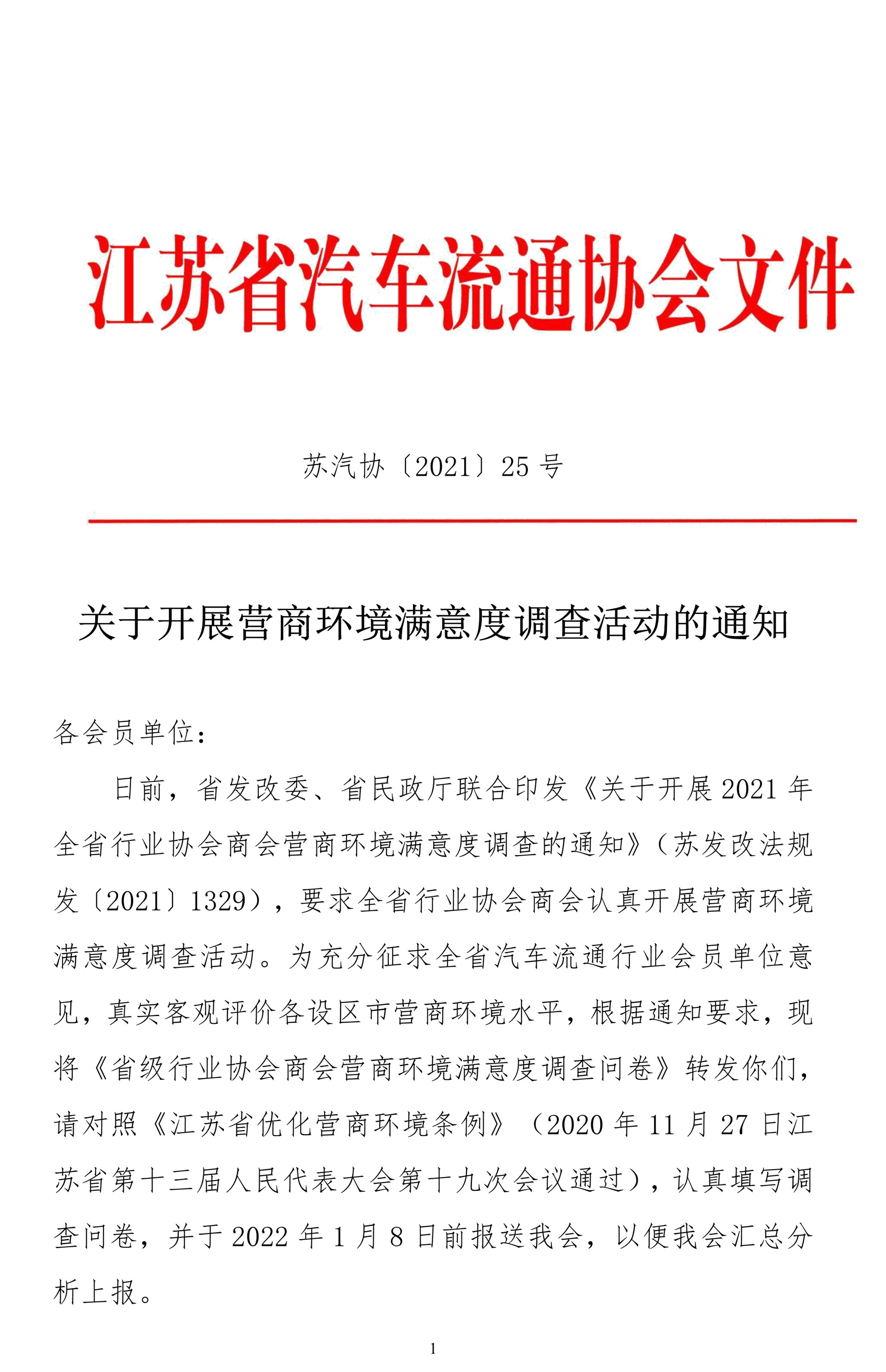 根據(jù)省發(fā)改委、省民政廳《關(guān)于開展2021年全省行業(yè)協(xié)會商會營商環(huán)境滿意度調(diào)查的通知》(蘇發(fā)改法規(guī)發(fā)〔2021〕1329)要求,請各會員單位認(rèn)真完成《省級行業(yè)協(xié)會商會營商環(huán)境滿意度調(diào)查問卷》(見通知附件)填報,在2022年1月8日前報送我會。
